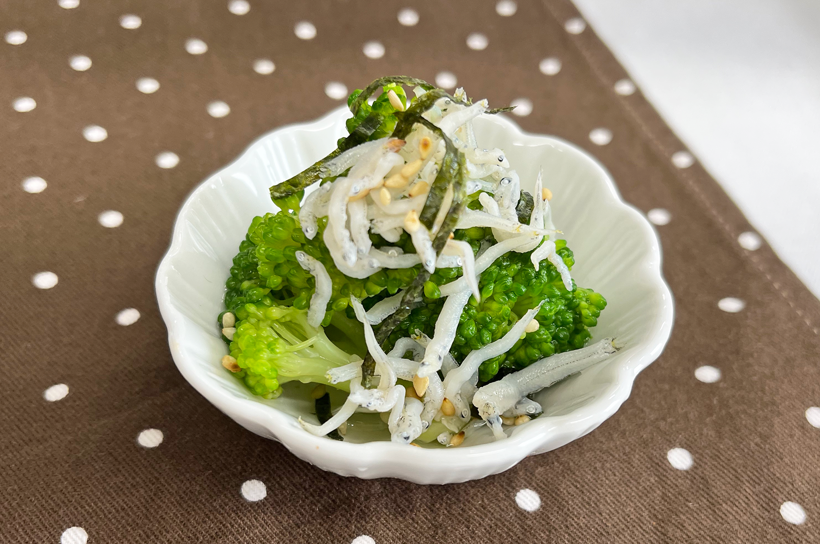 ブロッコリー(茹でた野菜)に1.の酢じゃこをのせて、お好みで胡麻と刻み海苔を散らす。
