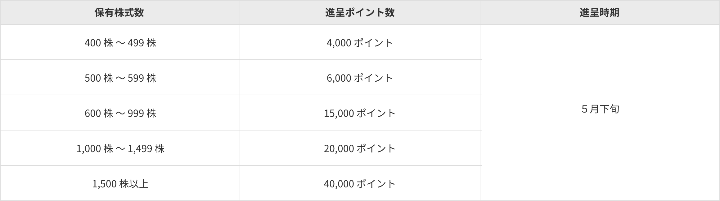 毎年3月31日現在の株主名簿に記載または記録された400株(4単元)以上の当社株式を保有されている株主さま