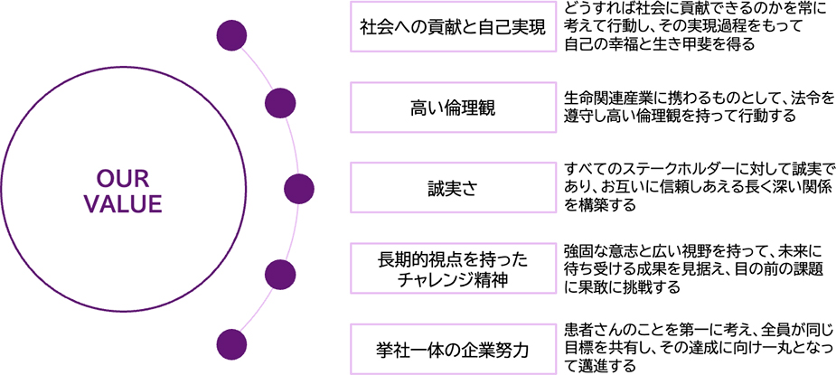 私たちは、パーパスやビジョンの実現に向け、価値観・行動基準として、5項目のバリューを設けています。大きく変動する製薬業界において、患者さんの生命を支え、社会に貢献し続ける人材を広く求めています。